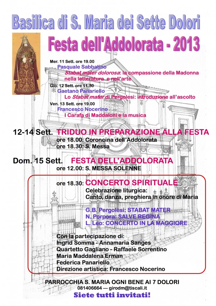 Pubblichiamo il programma della festa dell’Addolorata che si terrà nei prossimi giorni nella Basilica di S. Maria dei Sette Dolori nei quartieri spagnoli.