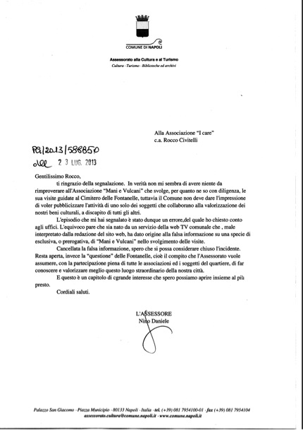 Dopo un primo contatto, l’assessorato alla cultura ha dichiarato di ignorare l’esistenza di questa pagina e si è impegnato ad intervenire subito. Ma la pagina è stata eliminata unicamente dalla home page, mentre è rimasta nel sito del Comune. Di fatto, chi va su internet, alla voce cimitero delle Fontanelle, continua a trovare una pubblicità fatta dal Comune di Napoli a favore dell’associazione Mani e Vulcani.